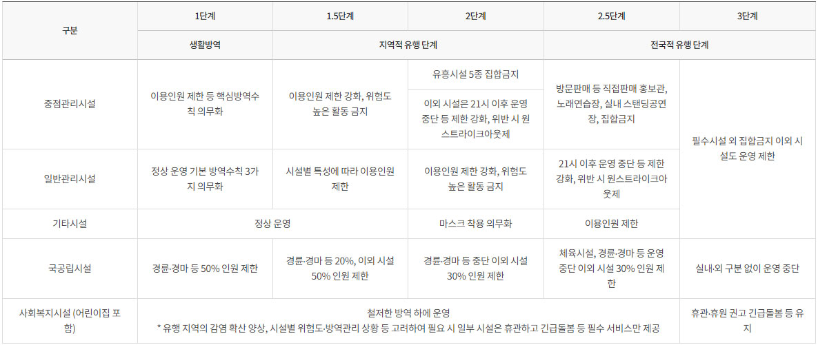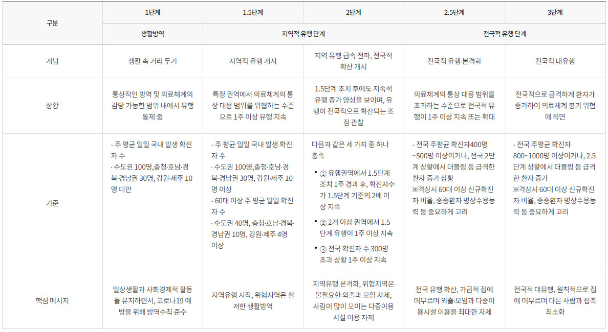 거리두기 단계별 기준 및 방역조치