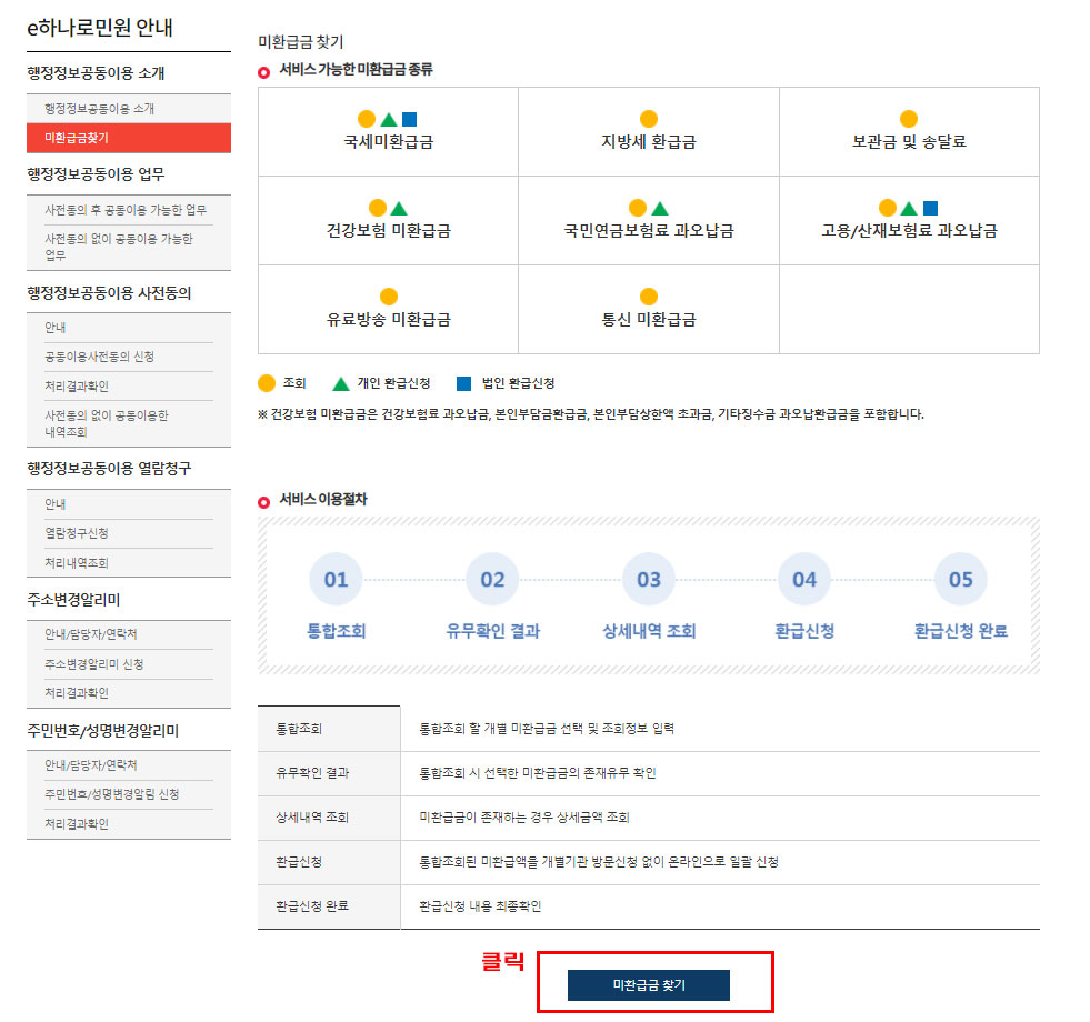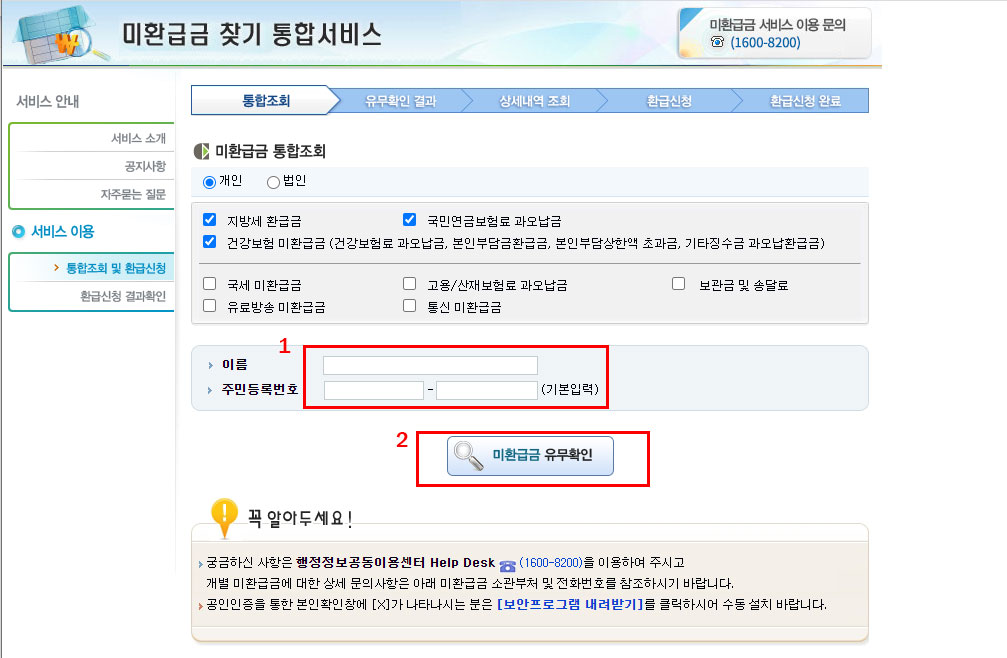 5. 이름, 주민등록번호 입력 > 미환급금 유무 확인 (클릭)