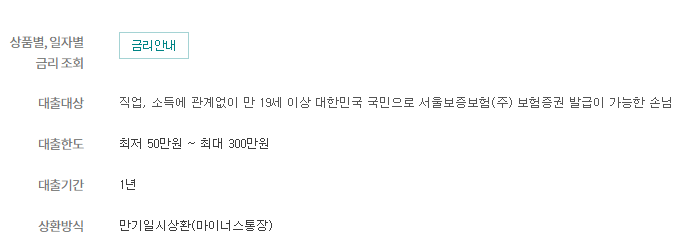 최대 300만원까지 가능하고 직업, 소득에 관계없이 대한민국 국민으로 서울보증보험(주) 보험증권 발급이 가능하면 대출을 받을 수 있다고 하는데요 상환방식도 원금과 이자를 함께 내는 방식이 아닌 이자만내는 방식(마이너스통장) 이라고 하니 매월 납입금액이 부담스러운 분들에게 도움이 될 수 있을 것 같습니다.